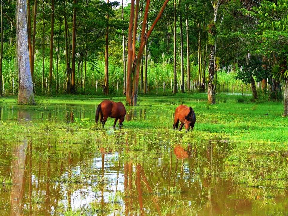 At its widest point the Amazon River can be 11km/6.8 mi wide during the dry season. The area covered by the Amazon River and its tributaries more than triples over the course of a year. In an average dry season 110,000 square km of land are water-covered, while in the wet season the flooded area of the Amazon Basin rises to 350,000 square km. When the flood plains and the Amazon River Basin flood during the rainy season the Amazon River can be up to 40km/24.8 mi wide. Where the Amazon opens at its estuary the river is over 325km/202 mi wide!